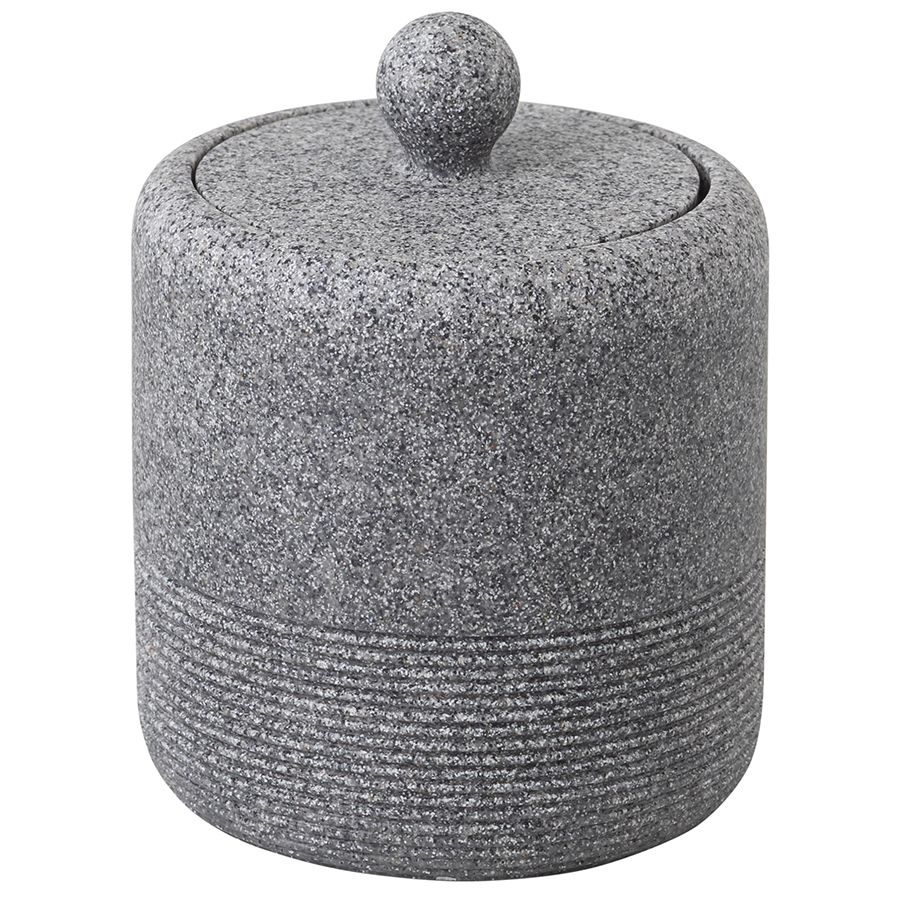 Банка для хранения Loup имеет корпус и крышку из полирезина, стилизованного под натуральный камень темно-серого оттенка. Материал легко моется, отличается устойчивостью к влаге, ударам и царапинам, что делает его идеальным выбором для ванной комнаты. Емкость компактных размеров занимает минимум места на полке или в шкафу. В такой банке можно удобно хранить средства гигиены и другие предметы личного пользования.