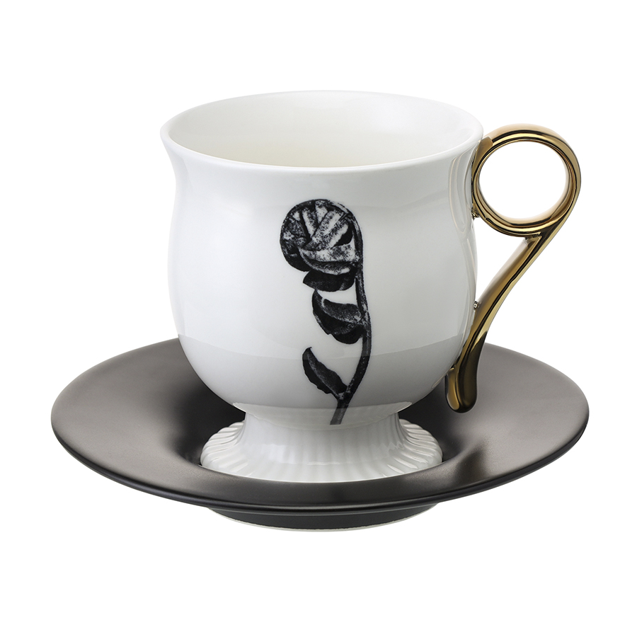 - Белоснежная чашка в сочетании с черным блюдцем создают эффектный контраст, акцентируя внимание на стильной сервировке.