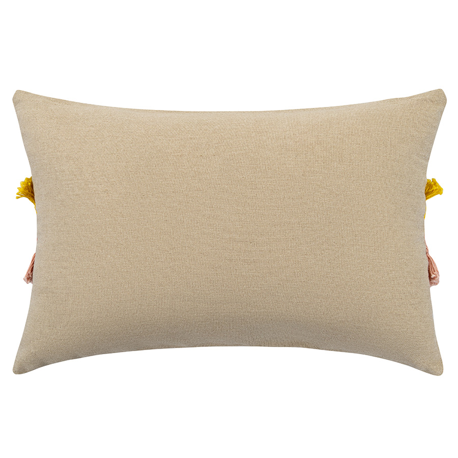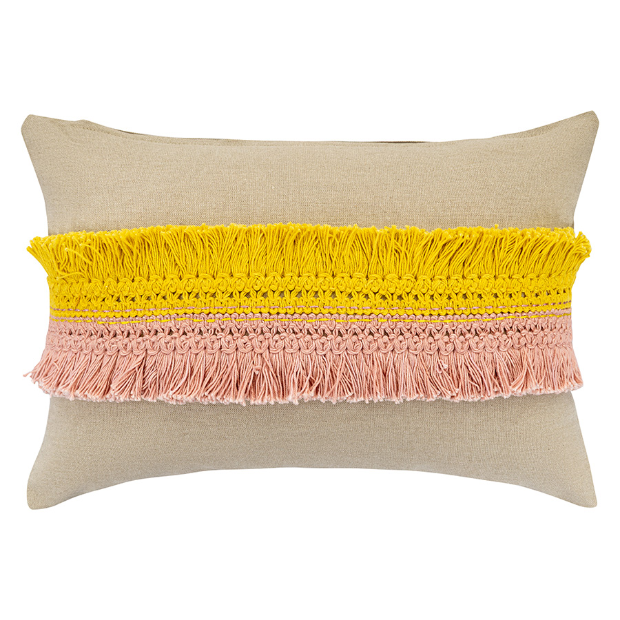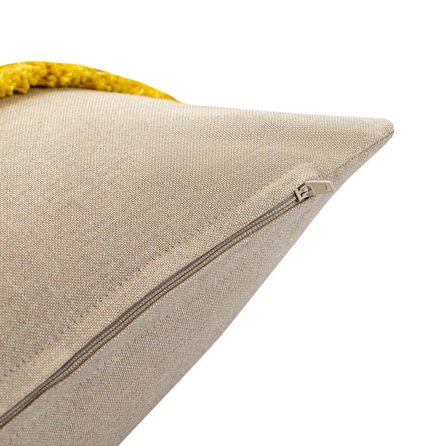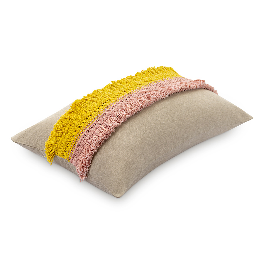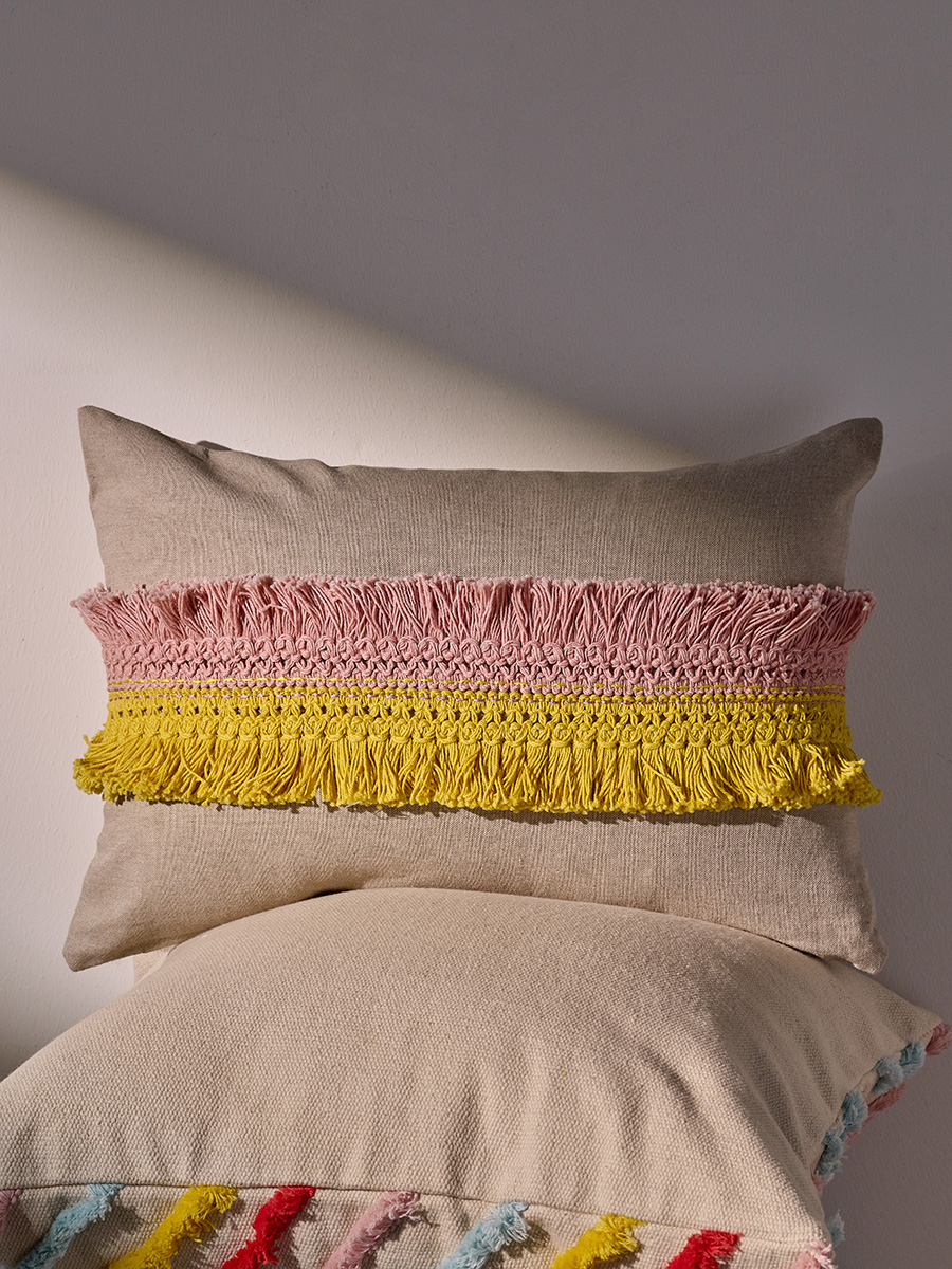 Изюминка этого чехла — объемная бахрома, которая создает необычную фактуру, а желтые и розовые оттенки усиливают вау-эффект. Подушка с таким чехлом в гостиной или детской — это не просто декор, а настоящий заряд дофамина и источник позитива. Эффект можно усилить, если добавить в композицию еще цветного текстиля, а можно немного приглушить, скомбинировав чехол с нейтральными аксессуарами.
