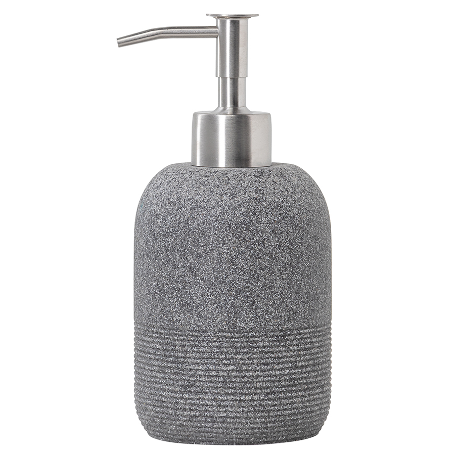 Диспенсер для жидкого мыла Loup имеет корпус из полирезина, стилизованного под натуральный камень темно-серого оттенка. Материал отличается устойчивостью к влаге, ударам и царапинам, что делает его идеальным выбором для ванной комнаты. Наружные элементы дозирующего механизма выполнены из нержавеющей стали, обладающей высокой прочностью, долговечностью и отличными антикоррозионными свойствами. Кроме того, ее блестящая поверхность придает изделию презентабельный вид.