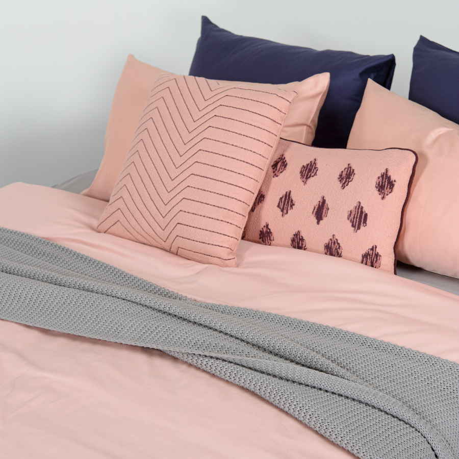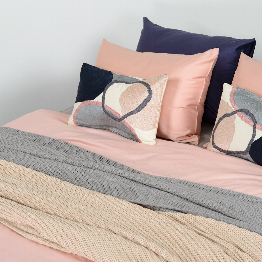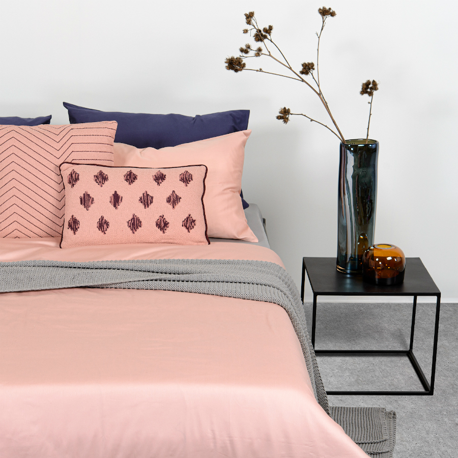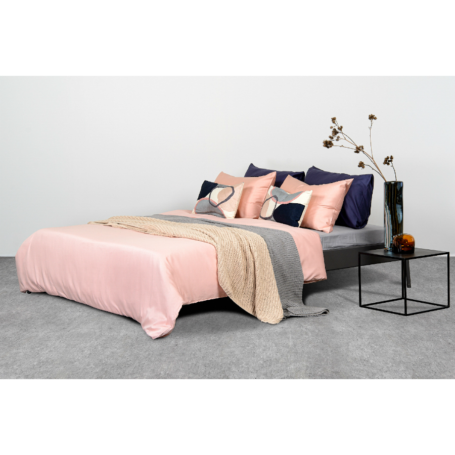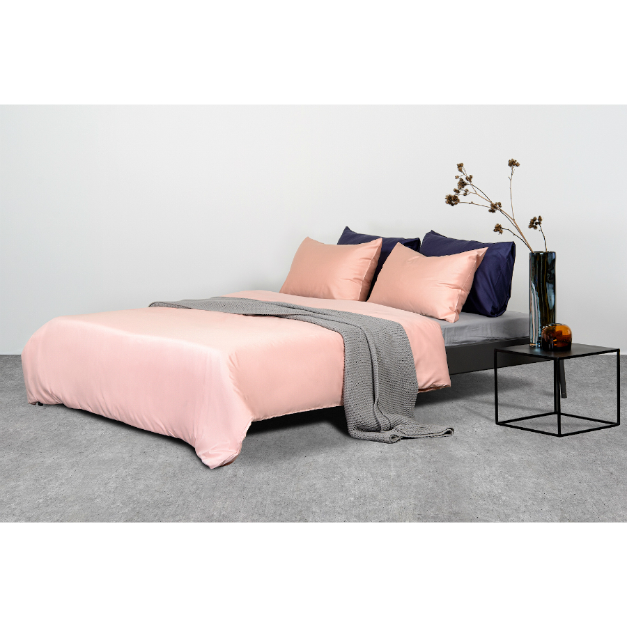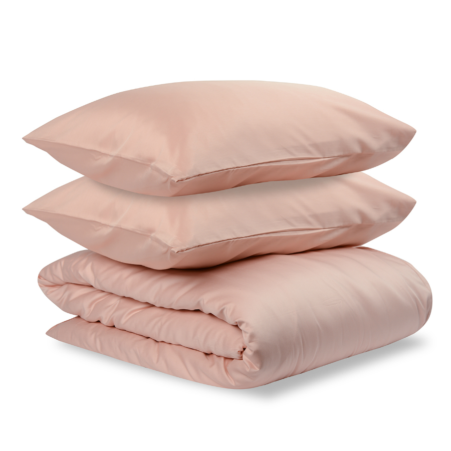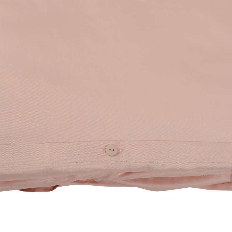 Пододеяльник и две наволочки 50х70 выполнены из плотного хлопкового сатина. Приятный на ощупь материал хорошо пропускает воздух, обеспечивая коже комфорт в течение сна. Однотонный комплект представлен в оттенке пыльной розы.