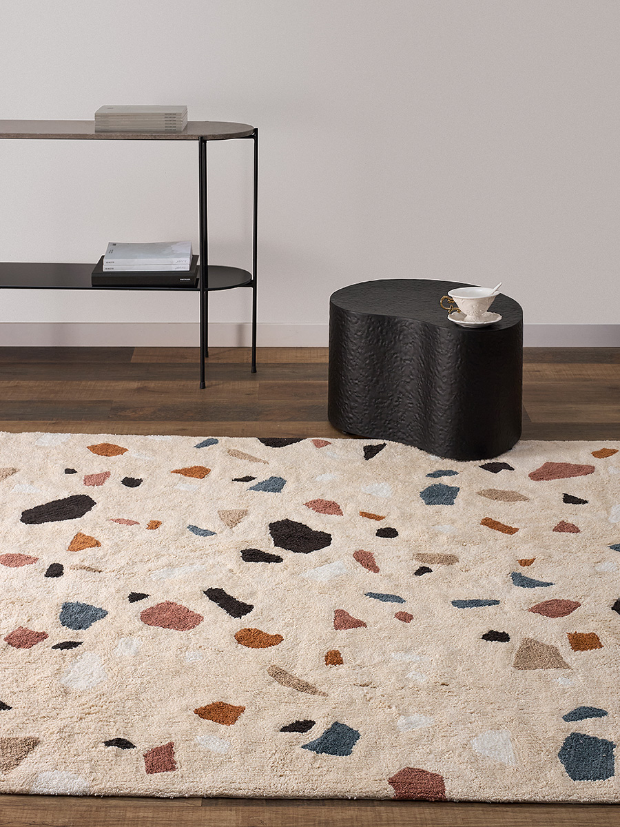 Терраццо — это особый материал родом из Италии, отполированная основа со вкраплениями гранита, мрамора или цветного стекла, создающими характерный мозаичный рисунок. Полы терраццо можно увидеть в парадных залах венецианских дворцов, а мы перенесли классический итальянский паттерн на мягкую поверхность хлопкового ковра. Прекрасное решение для тех, кто любит классику в необычном проявлении.