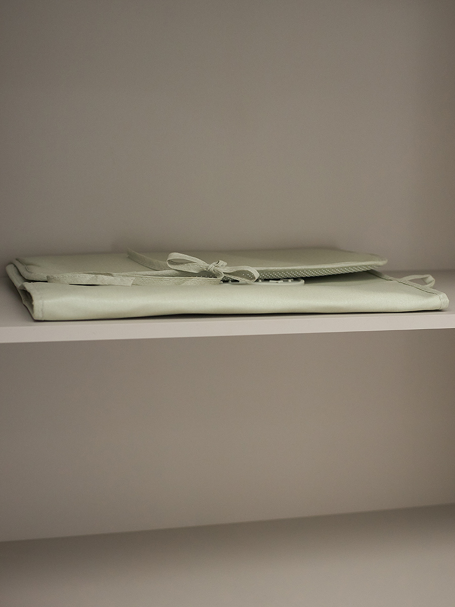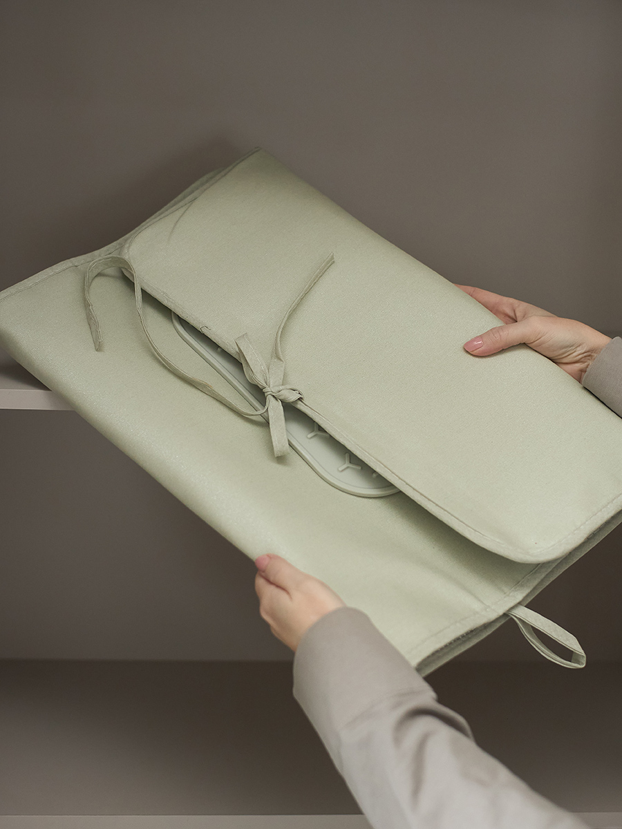 - В комплект входит защитный чехол для подставки под утюг. И у чехла, и у самого коврика есть петельки, чтобы вешать их на крючок, тем самым сэкономив место.