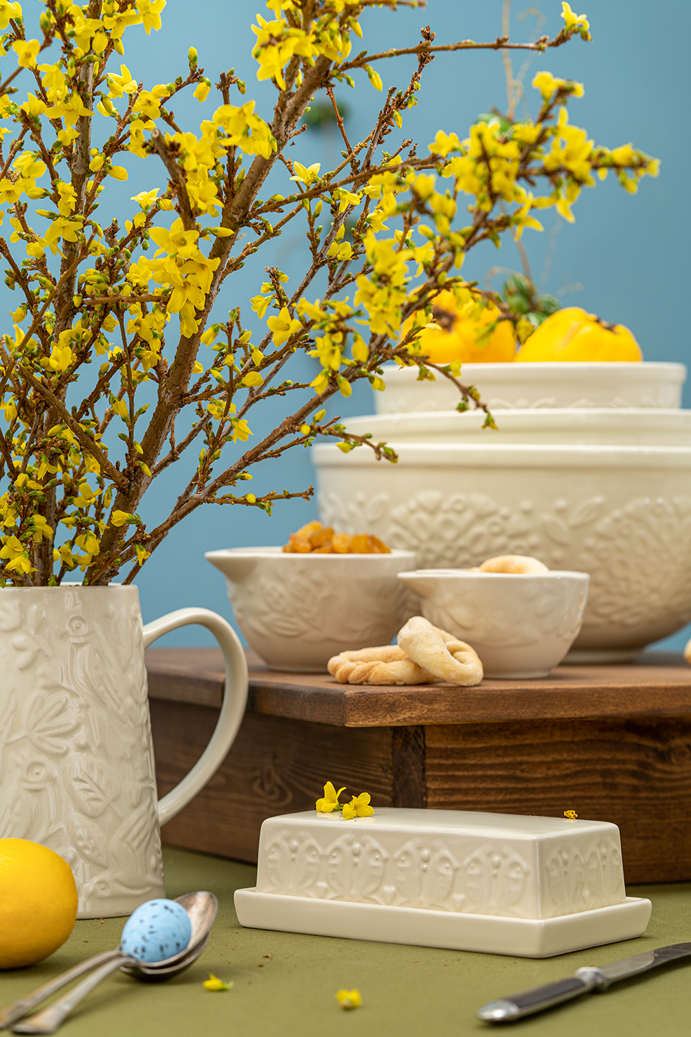 Масленка из коллекции Birds of Paradise – качественная посуда из экологичной каменной керамики, которая дольше сохраняет продукты свежими и великолепно дополняет любую сервировку. Отличительной особенностью серии является объемный узор природной тематики, придающий дизайну элегантные нотки. Благодаря высокой прочности и устойчивости материала к износу изделие не теряет привлекательный внешний вид на протяжении всего срока службы. Покрытие глазурью облегчает уход, обеспечивает декоративность и дополнительную защиту от внешних воздействий. Масленка состоит из поддона для масла с небольшими бортиками и объемной крышки прямоугольной формы.