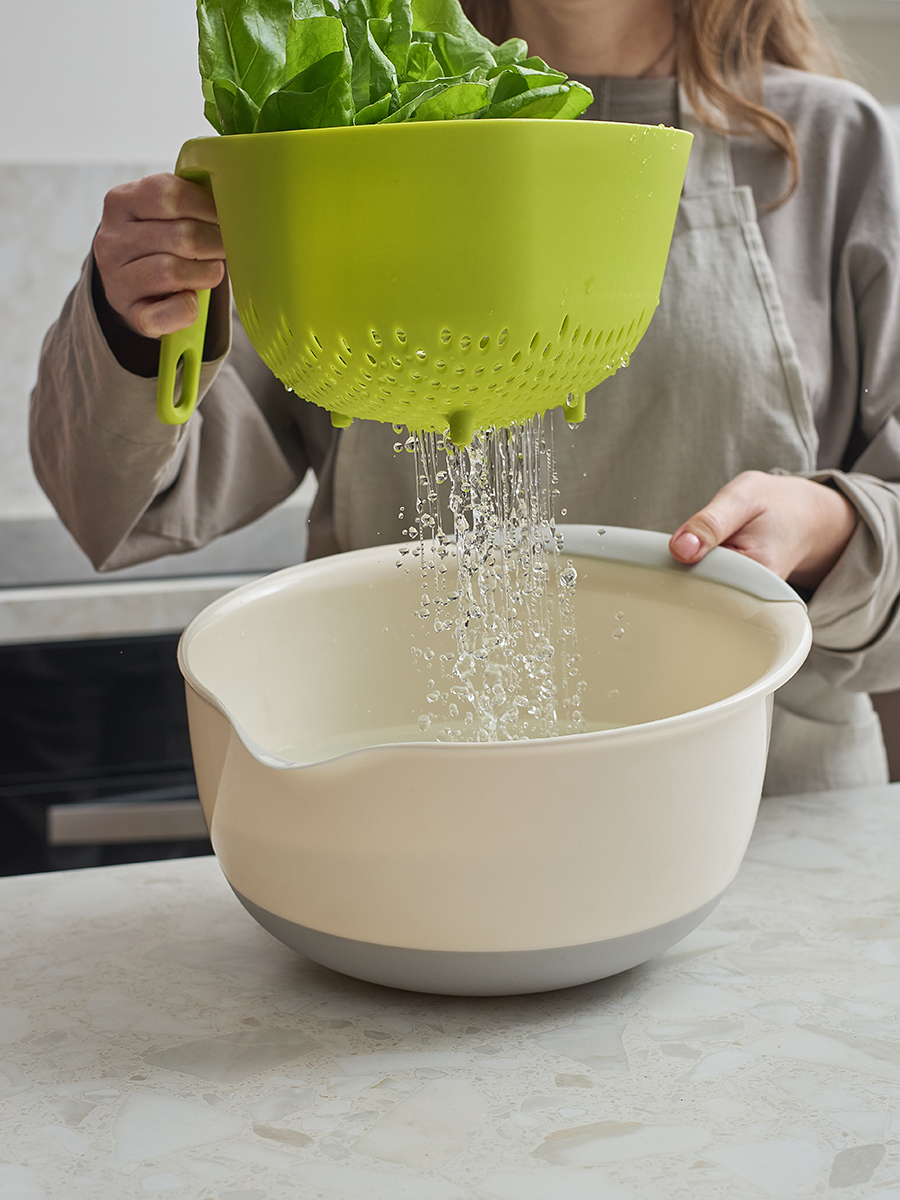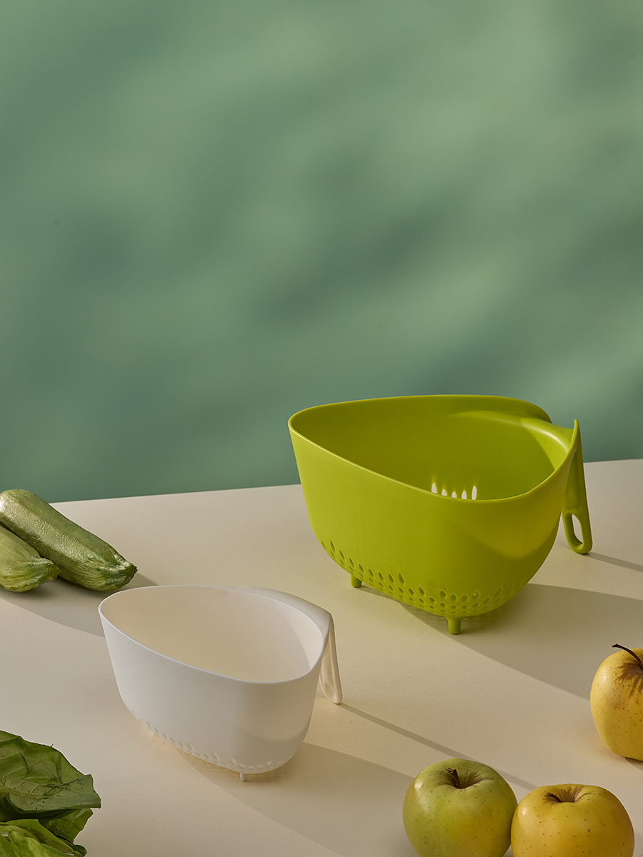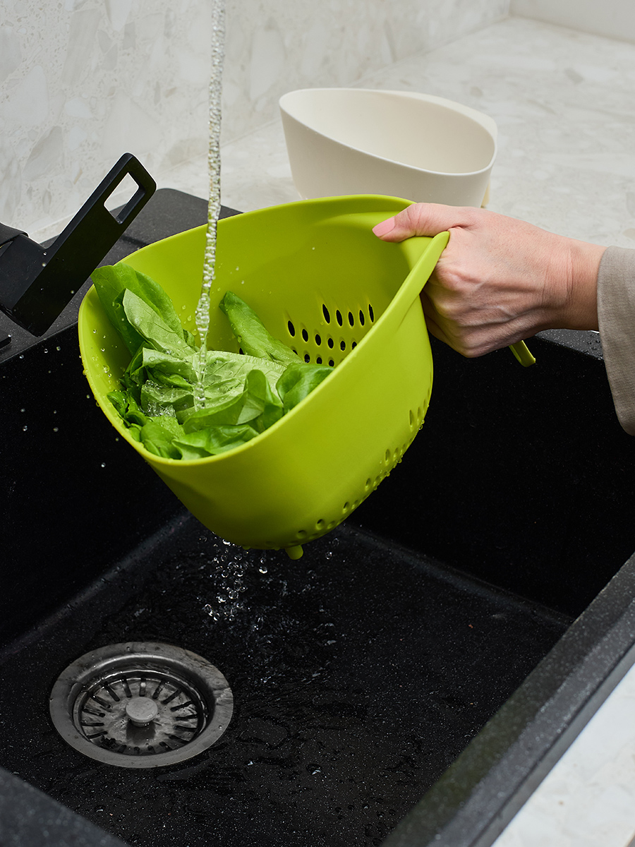 Легкие и прочные дуршлаги из полипропилена выполнены в двух размерах. Ручку эргономичной формы очень удобно держать, что облегчает процесс промывания продуктов или сливания жидкости. Изделия выполнены в приятных цветах — молочном и салатовом.