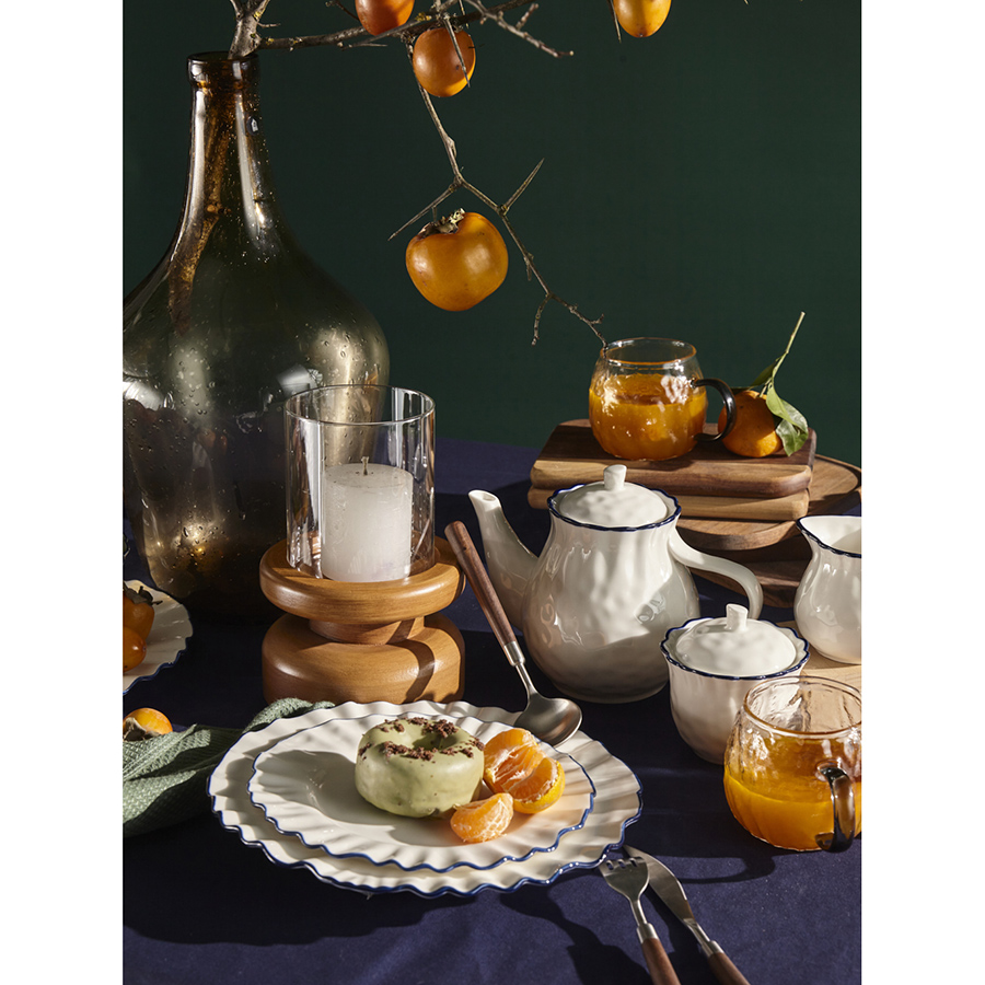 Коллекция Santorini великолепно передает атмосферу уединенного греческого острова, известного своими завораживающими видами и удивительной архитектурой. Оттенки белого и синего напоминают о бескрайнем море и уютных домиках на скалах, а необычная “мятая” фактура фарфора ассоциируется с каменистыми склонами и живописными утесами.