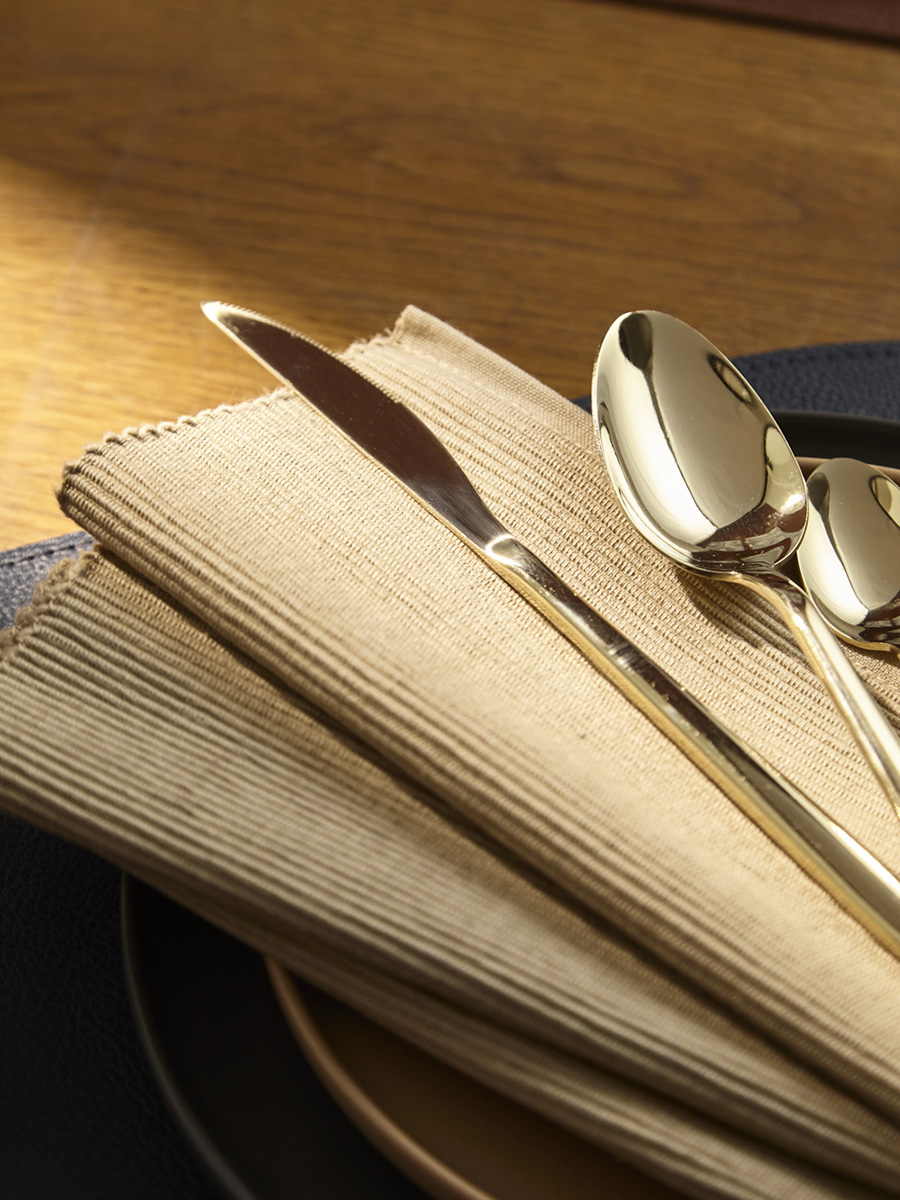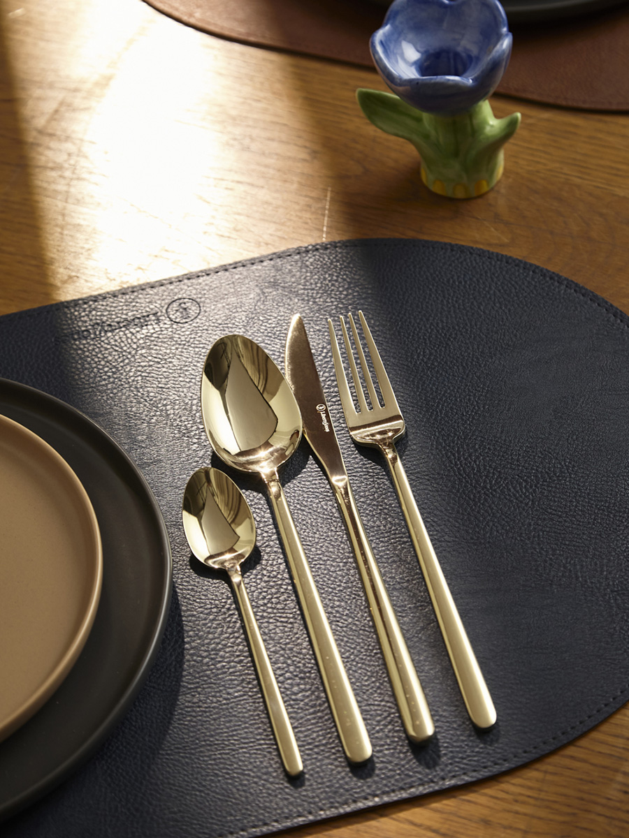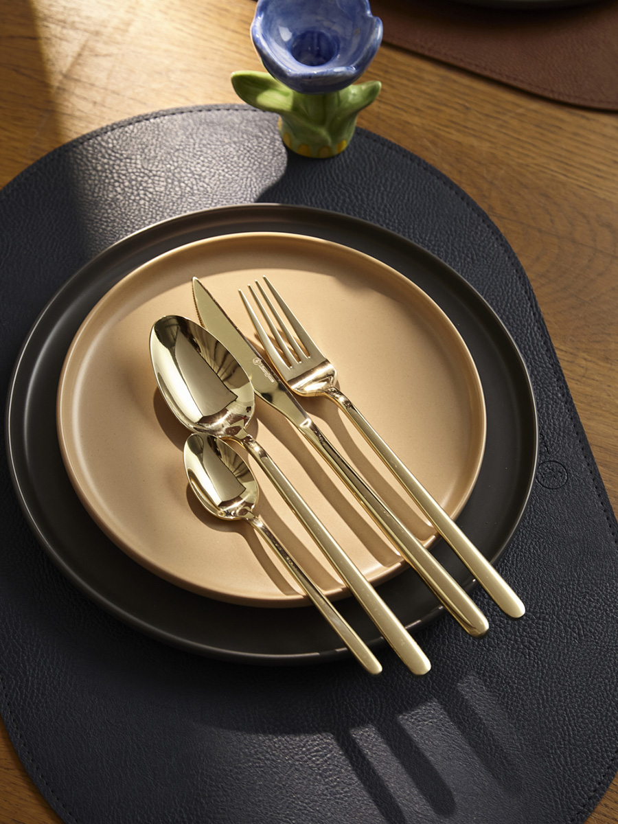 - Столовые приборы золотистого цвета с зеркальной полировкой идеально вписываются в классическую и традиционную сервировку, прекрасно сочетаясь с белоснежной скатертью и фарфоровой посудой. В современных решениях они могут служить ярким акцентом на фоне простых и лаконичных элементов.