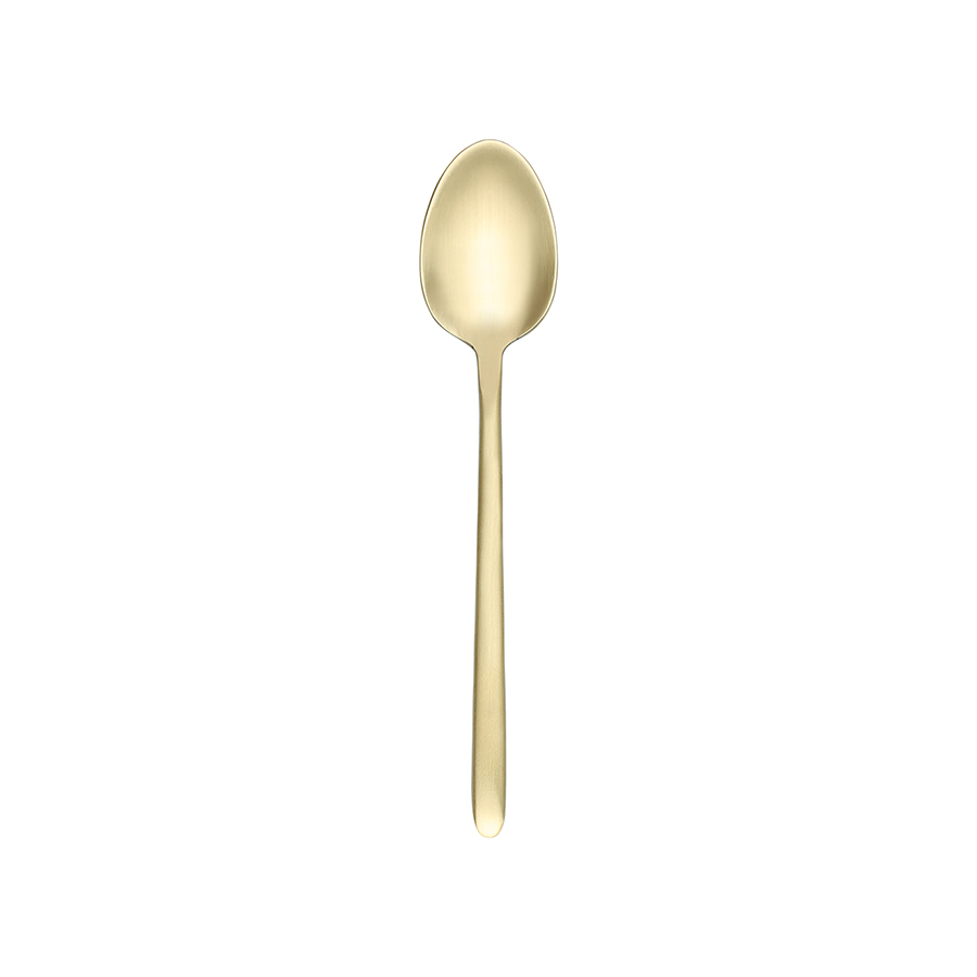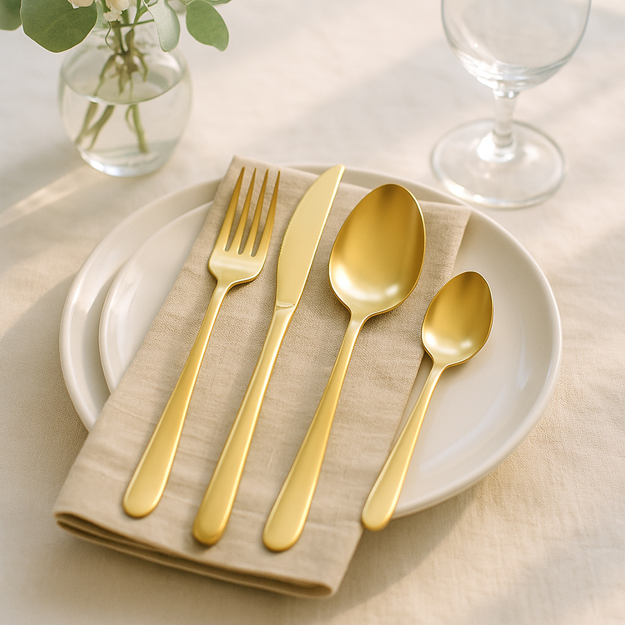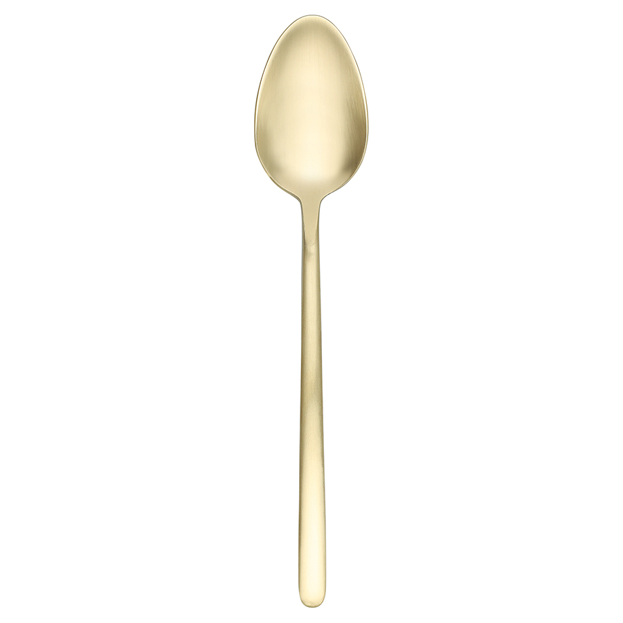 - Столовые приборы золотистого цвета с матовой полировкой отлично подойдут для сервировки в традиционном и современном стиле. Их сдержанная элегантность прекрасно гармонирует с простыми формами и нейтральными цветами.