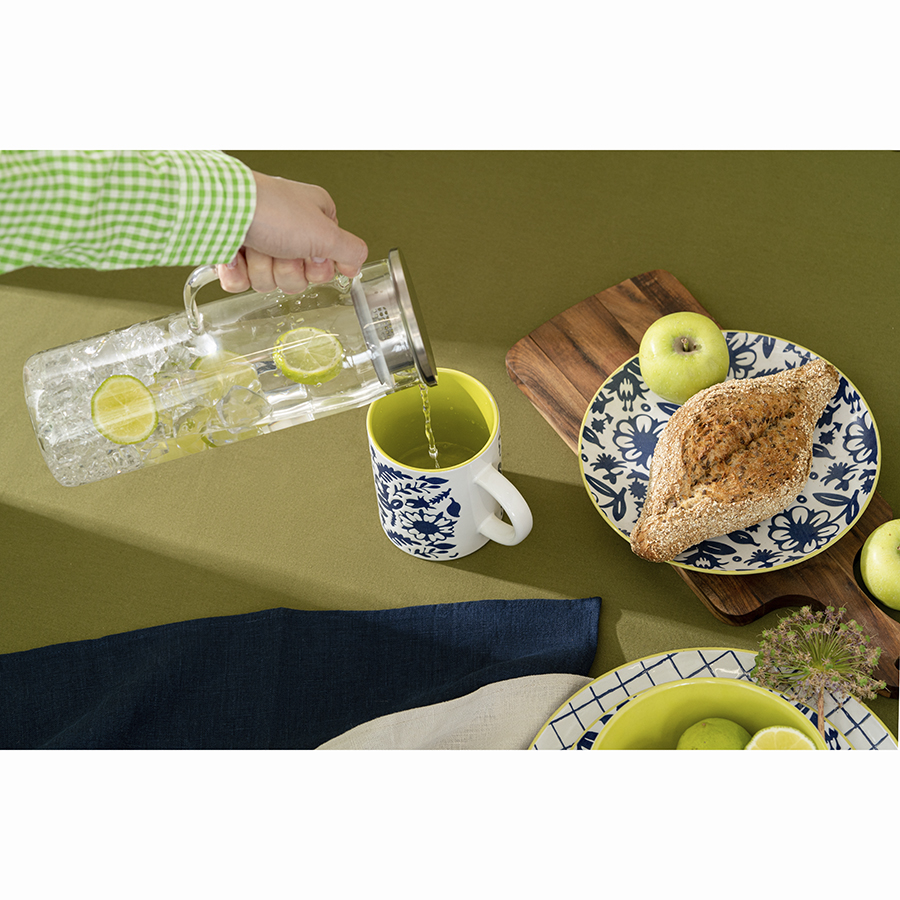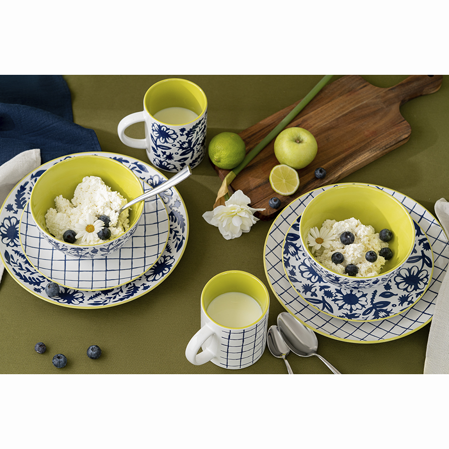 Для создания коллекции Bright Traditions дизайнеры использовали уникальную технологию нанесения орнамента через тиснение и многоступенчатое покрытие полуматовой глазурью. В результате получилась красивая посуда ярких летних оттенков с приятной на ощупь фактурной поверхностью. Комбинация клетки и растительного орнамента делает эту линейку свежим акцентом в любой сервировке.