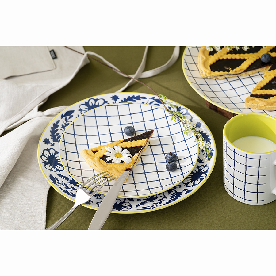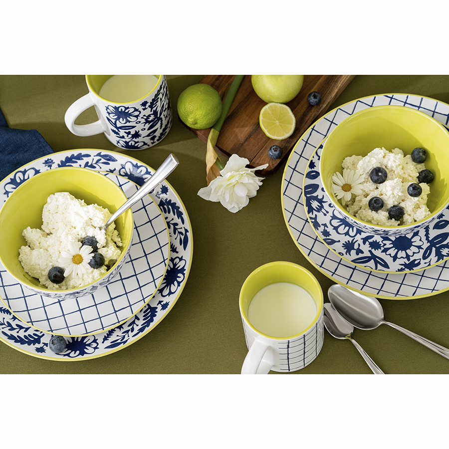 Для создания коллекции Bright Traditions дизайнеры использовали уникальную технологию нанесения орнамента через тиснение и многоступенчатое покрытие полуматовой глазурью. В результате получилась красивая посуда ярких летних оттенков с приятной на ощупь фактурной поверхностью. Комбинация клетки и растительного орнамента делает эту линейку свежим акцентом в любой сервировке.
