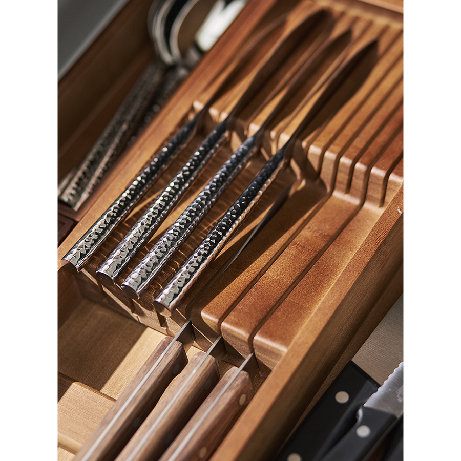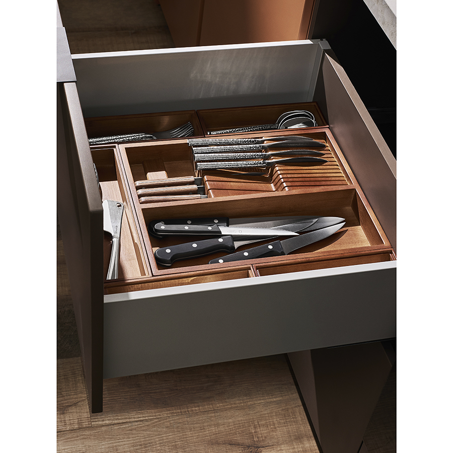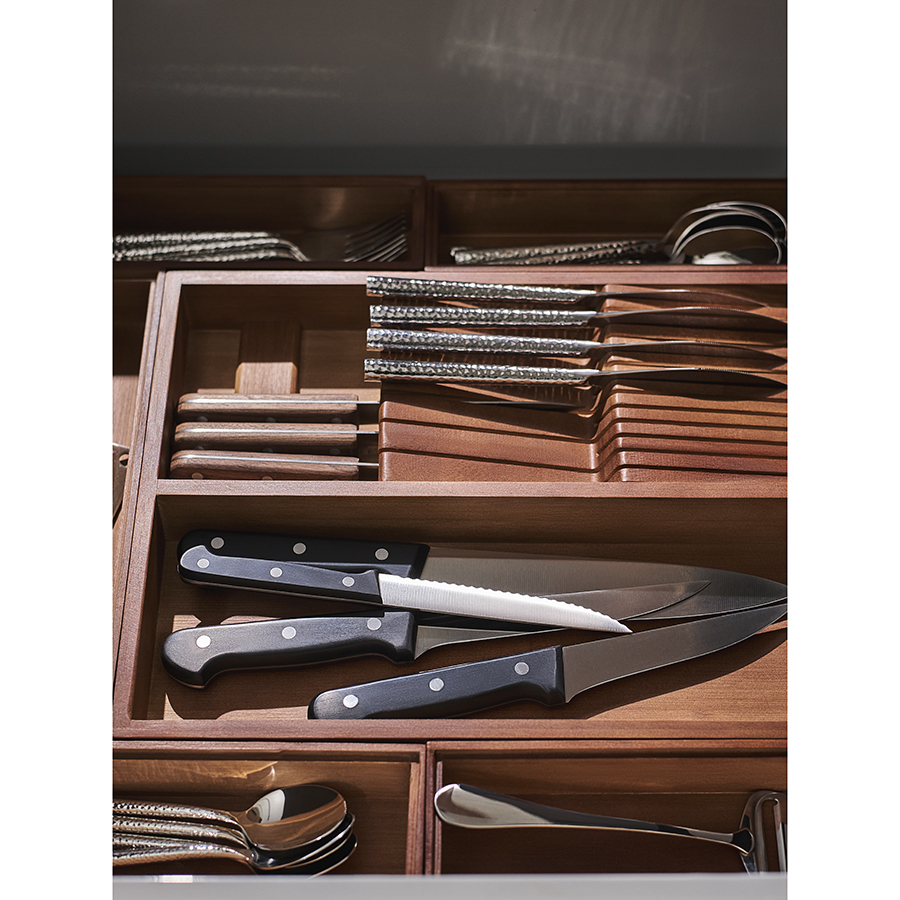 - Имеет несколько отделений и специальный держатель для ножей, что позволяет раздельно хранить все виды столовых приборов.