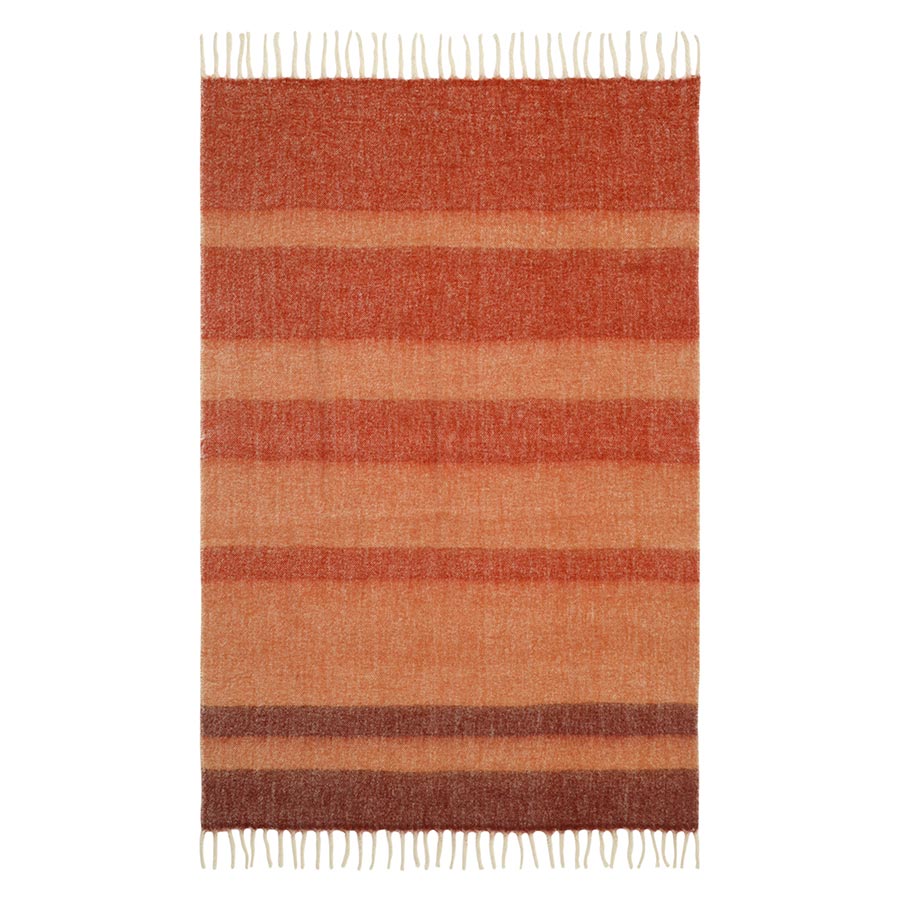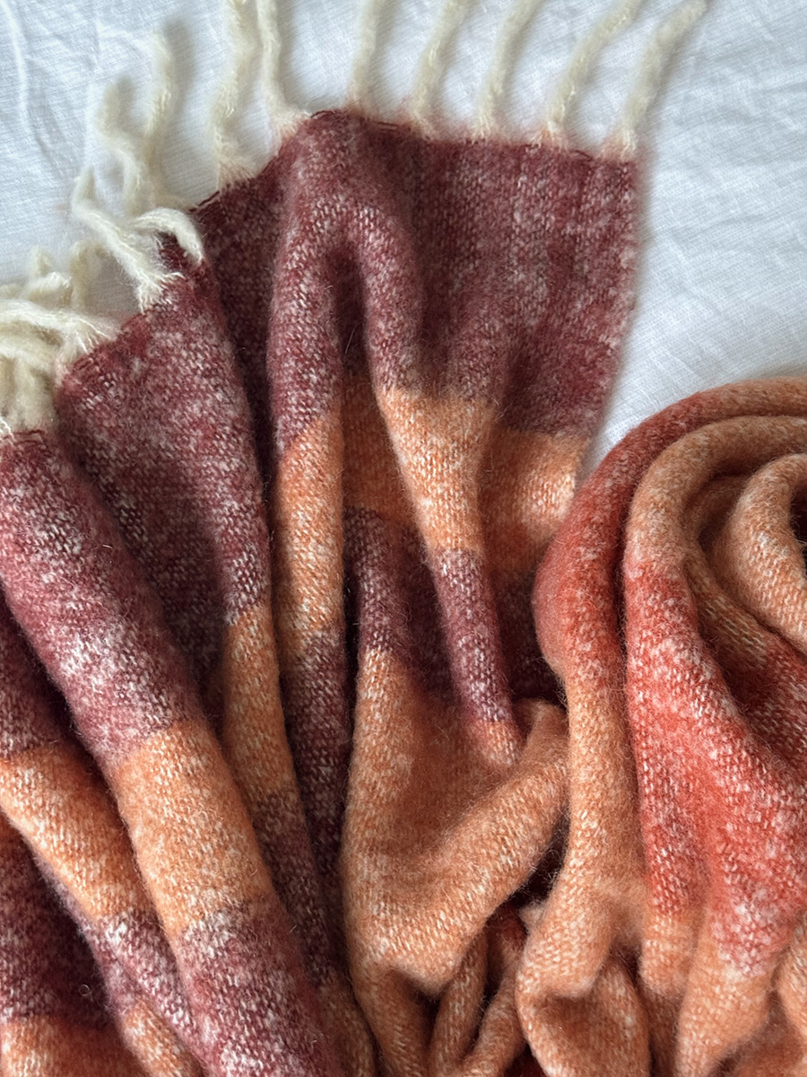 Мохеровый плед Over Horizon раскрывает историю света, тепла и тихого созерцания. Его палитра ритмично переходит от теплого терракотового до светлого с медовым оттенком. Контрастные полосы создают спокойный, выверенный ритм и ощущение визуального баланса — словно горизонт, растворяющийся в мягком рассеянном свете.