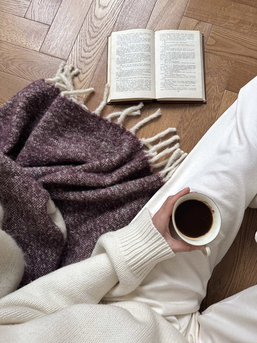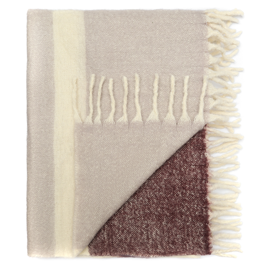 Мохеровый плед Over Horizon раскрывает историю света, тепла и тихого созерцания. Его палитра построена вокруг насыщенного и глубокого цвета марсала, дополненного мягкими молочными оттенками. Полосы выстраиваются в плавный ритм, создавая ощущение равновесия и визуальной тишины.