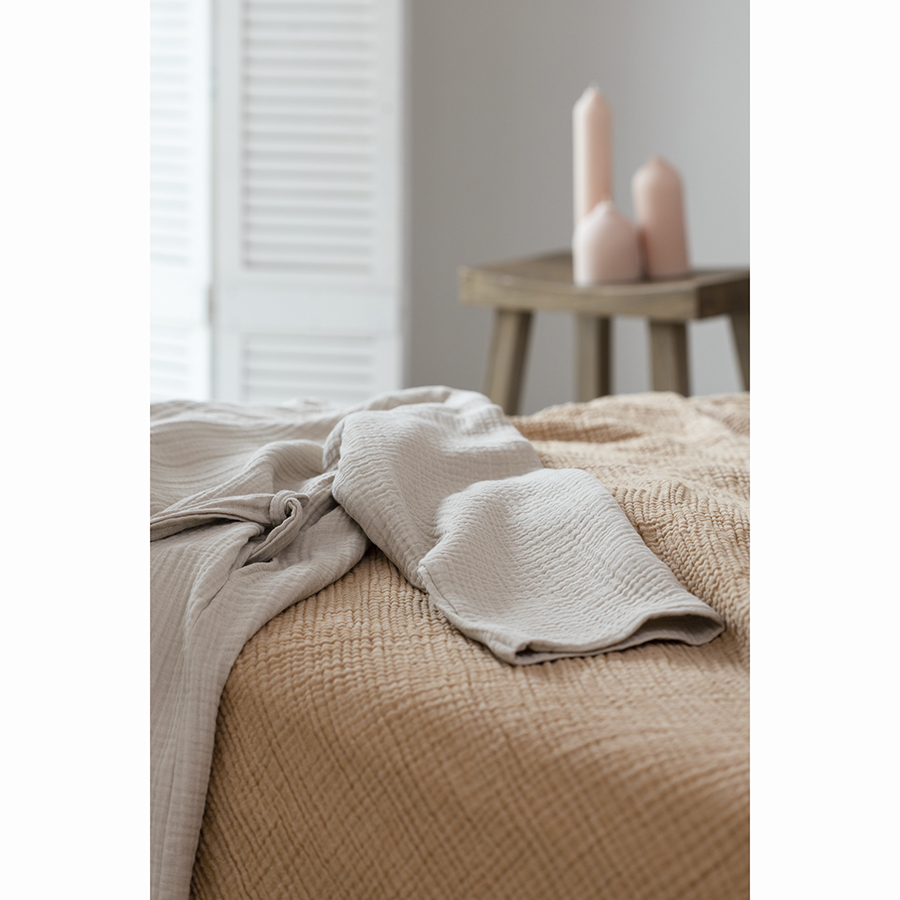 Покрывало двухсторонее из многослойного муслина цвета охры из коллекции Essential сделает интерьер спальни уютным и подарит чувство комфорта при использовании. Легкий, дышащий материал на основе экологичного хлопкового волокна приятный на ощупь, хорошо впитывает влагу, не электризуется и не вызывает аллергию. За счет специального переплетения нитей в каждом из четырех слоев ткань имеет интересную фактуру, обладает высокой плотностью, устойчивостью к износу, не скатывается и хорошо держит форму. Элегантная простота муслинового покрывала позволяет вписать его в различные стилевые решения интерьера: сканди, кантри, прованс, эклектика, бохо, эко, минимализм и другие.