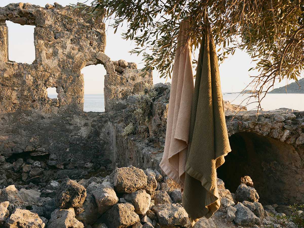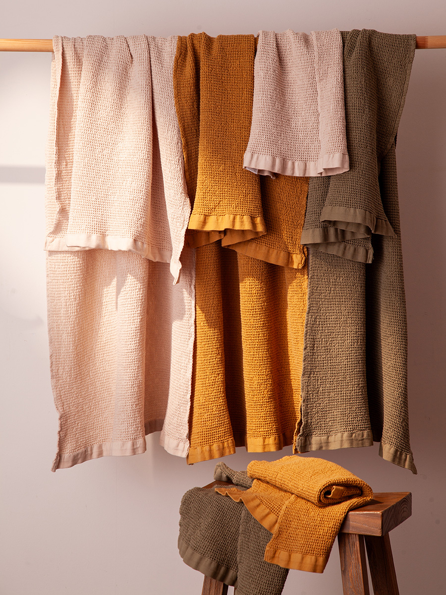 - Благодаря вафельному плетению материал хорошо пропускает воздух, быстро сохнет и отличается легкостью.