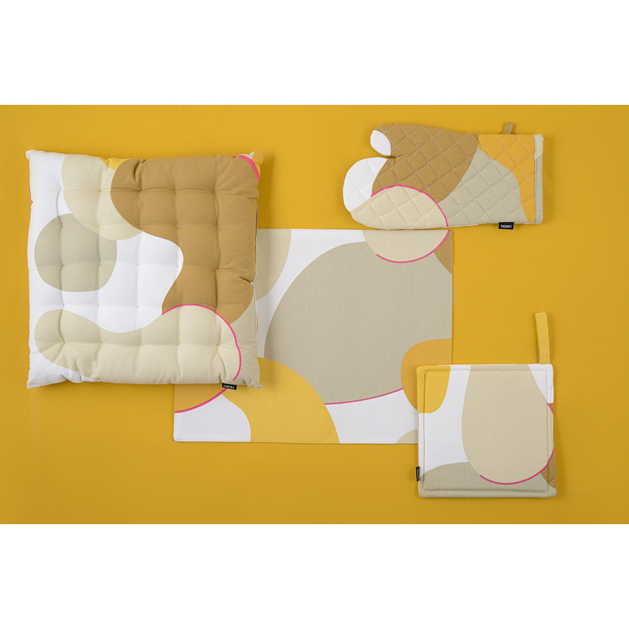 Прихватка-варежка из хлопка горчичного цвета с авторским принтом из коллекции Freak Fruit– универсальный кухонный аксессуар. Абстрактный принт не имеет повторяющегося раппорта и представляет собой единую законченную картину.