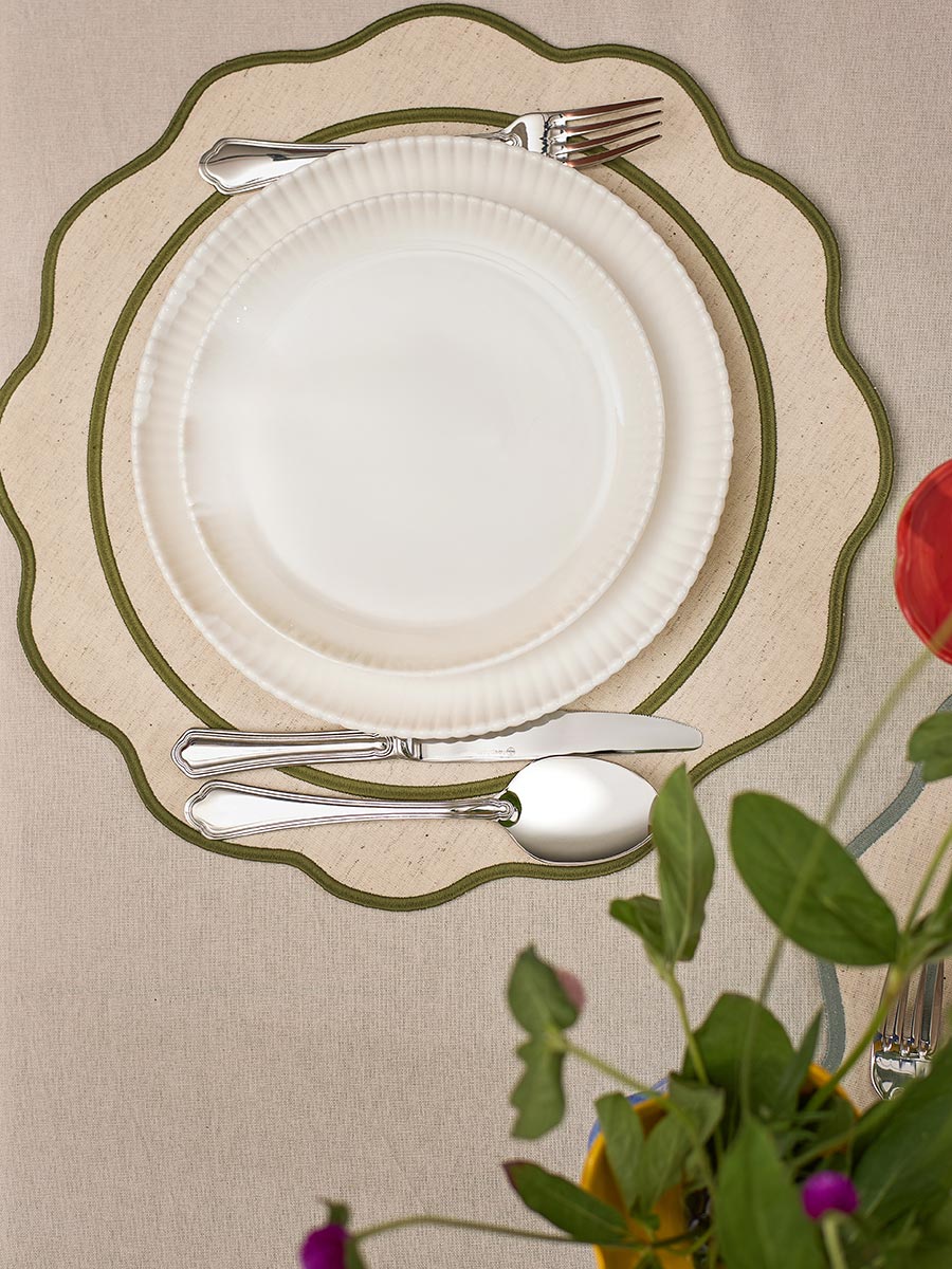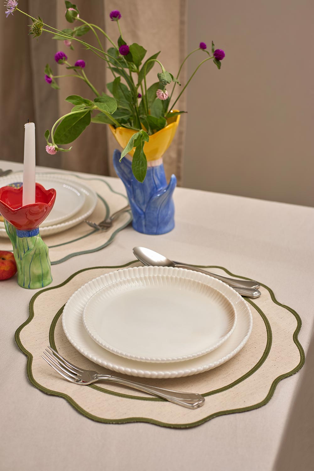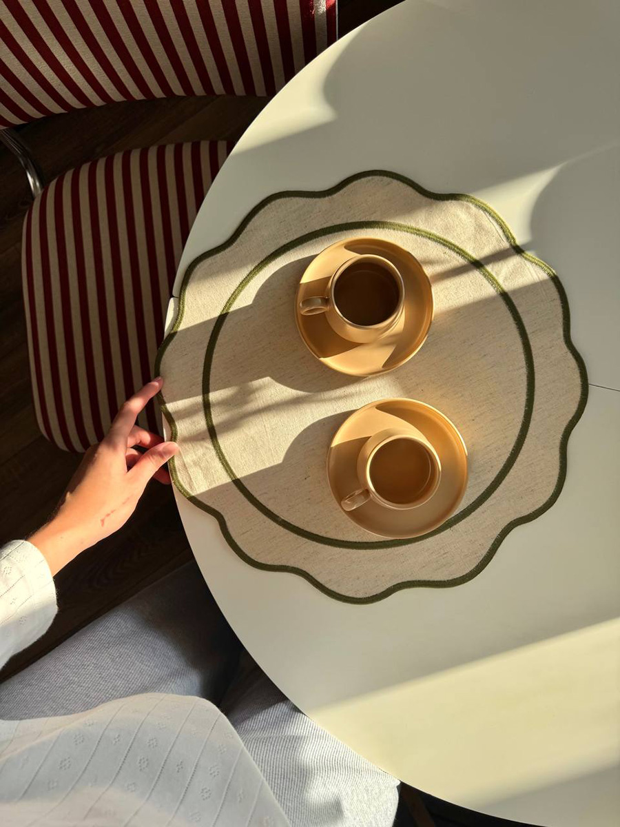 Салфетка под приборы Anemone из коллекции Trendy Ruffles с кантом оливкового цвета сделает любую сервировку стильной, позволив экспериментировать с текстурами и формами. Текстиль с волнистой отделкой, напоминающей изящные раковины морских гребешков, стал ярким элементом стиля Ар Деко – и сейчас возвращается в моду, появляясь в самых актуальных интерьерных решениях.