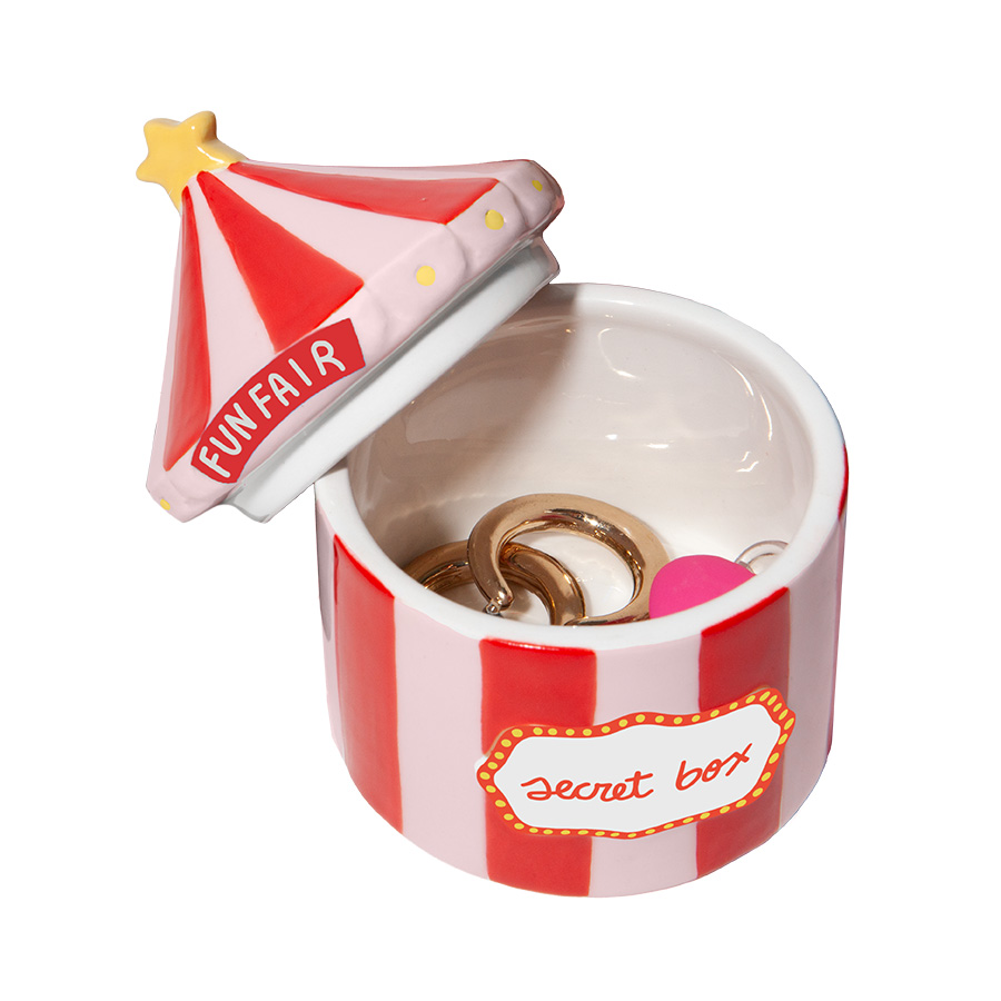 Перенесите магию ярмарочного чуда в свой дом с очаровательной керамической шкатулкой из коллекции Funfair в форме полосатой палатки загадочного цирка-шапито. Ее классические бело-алые полосы стремятся ввысь к изящному шпилю, украшенному золотой звездой. Они создают ощущение, что под куполом из керамики хранятся не просто вещи, а самые дорогие сердцу воспоминания.