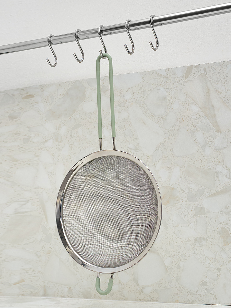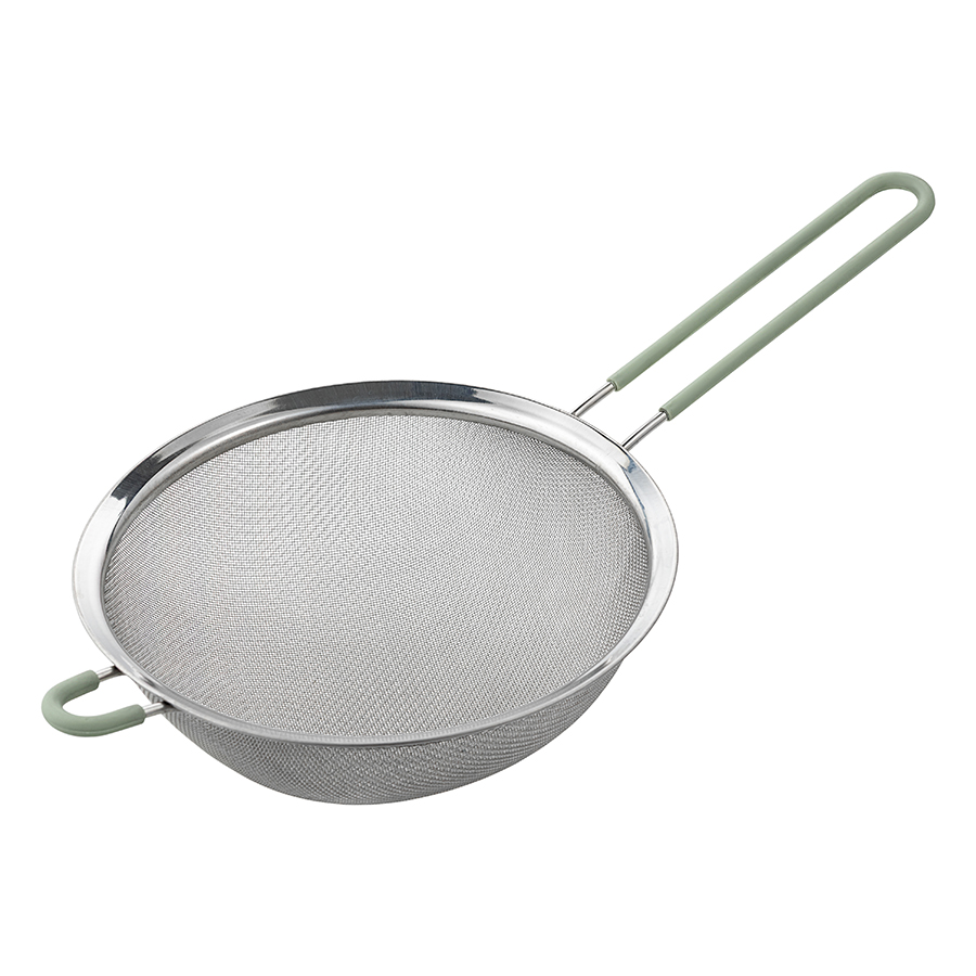 Сито из нержавеющей стали диаметром 20 см с ручкой и широким ободком подойдет для просеивания пудры, муки, какао, кофе и других мелких сыпучих продуктов. Его можно использовать, чтобы украсить сахарной пудрой выпечку, промыть и протереть ягоды, профильтровать жидкость от мякоти и ненужных остатков. Прибор также подойдет для сливания макарон, риса и других круп. Удобная стальная петля с силиконовой насадкой надежно удерживает сито на кастрюле или другой посуде, не давая соскользнуть, а также может использоваться для навески.