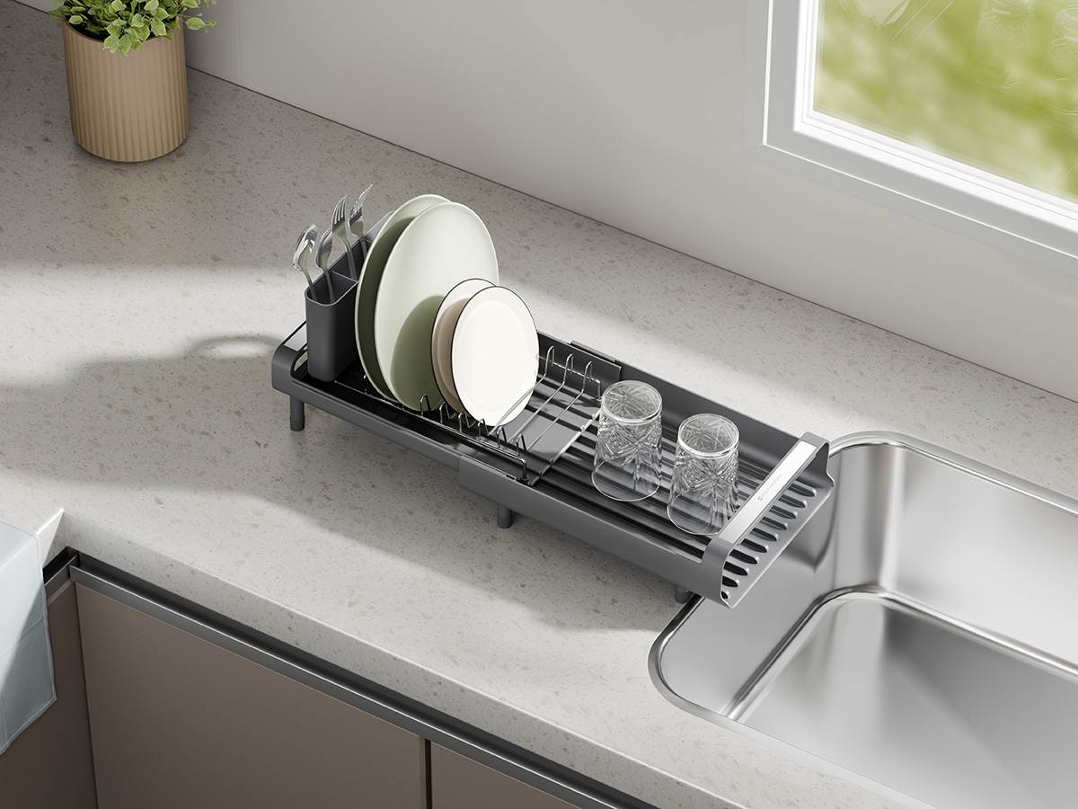 - Раздвижная конструкция позволяет регулировать размер в зависимости от объема посуды