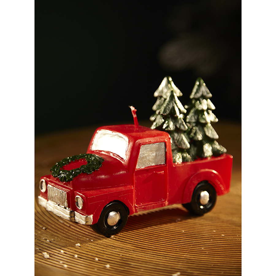 - Свеча выполнена в виде грузовика с ёлками, что делает ее не только источником света, но и украшением интерьера.