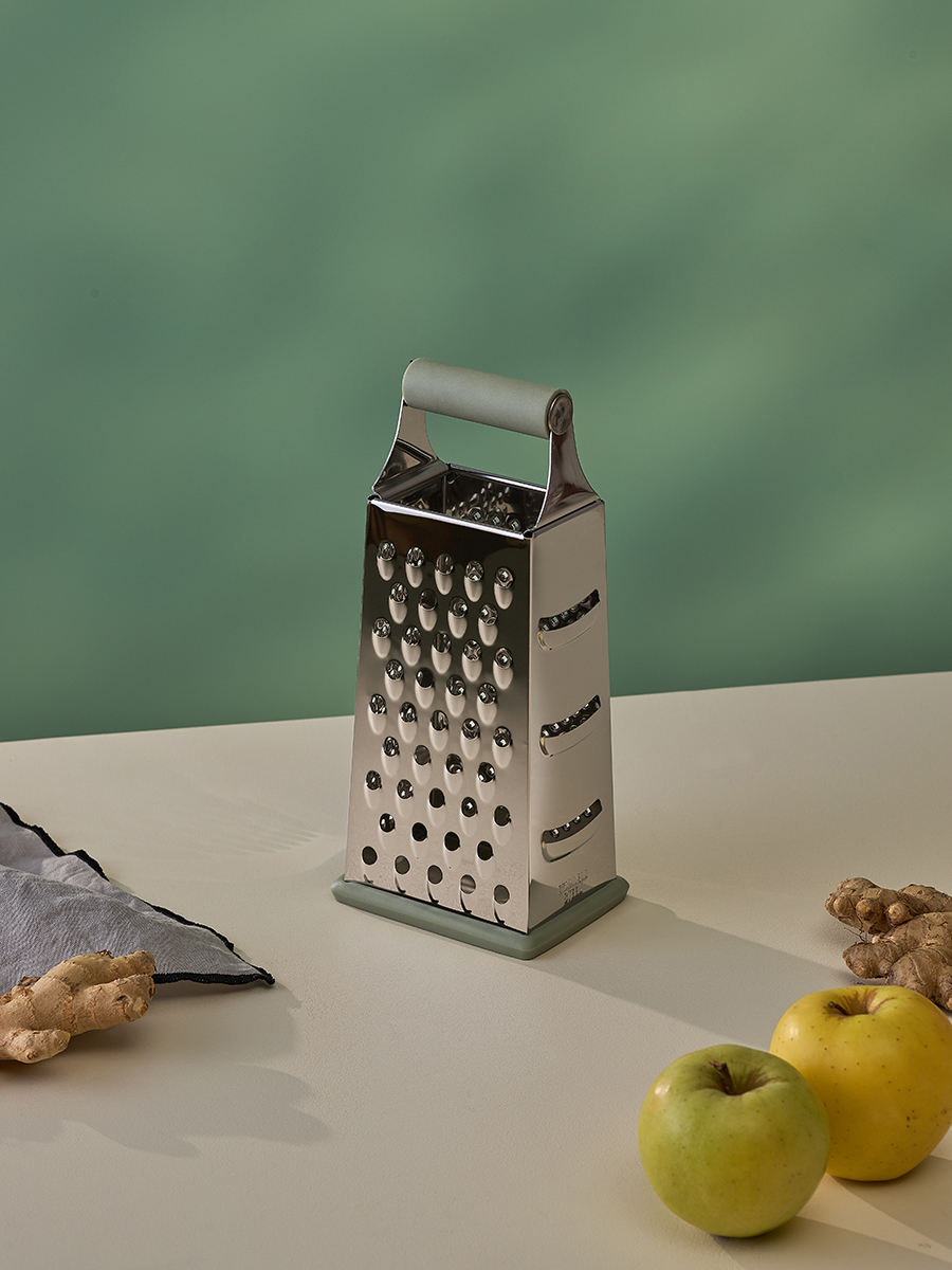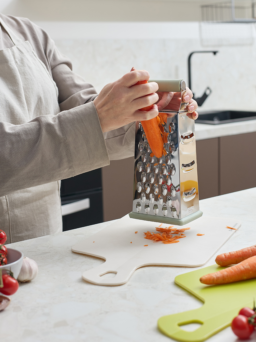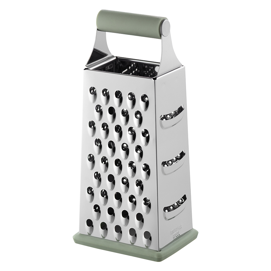 Четырехсторонняя терка из нержавеющей стали подойдет для овощей, фруктов, сыра и других продуктов. 4 рабочих поверхности прибора позволяют выбрать размер измельчения.